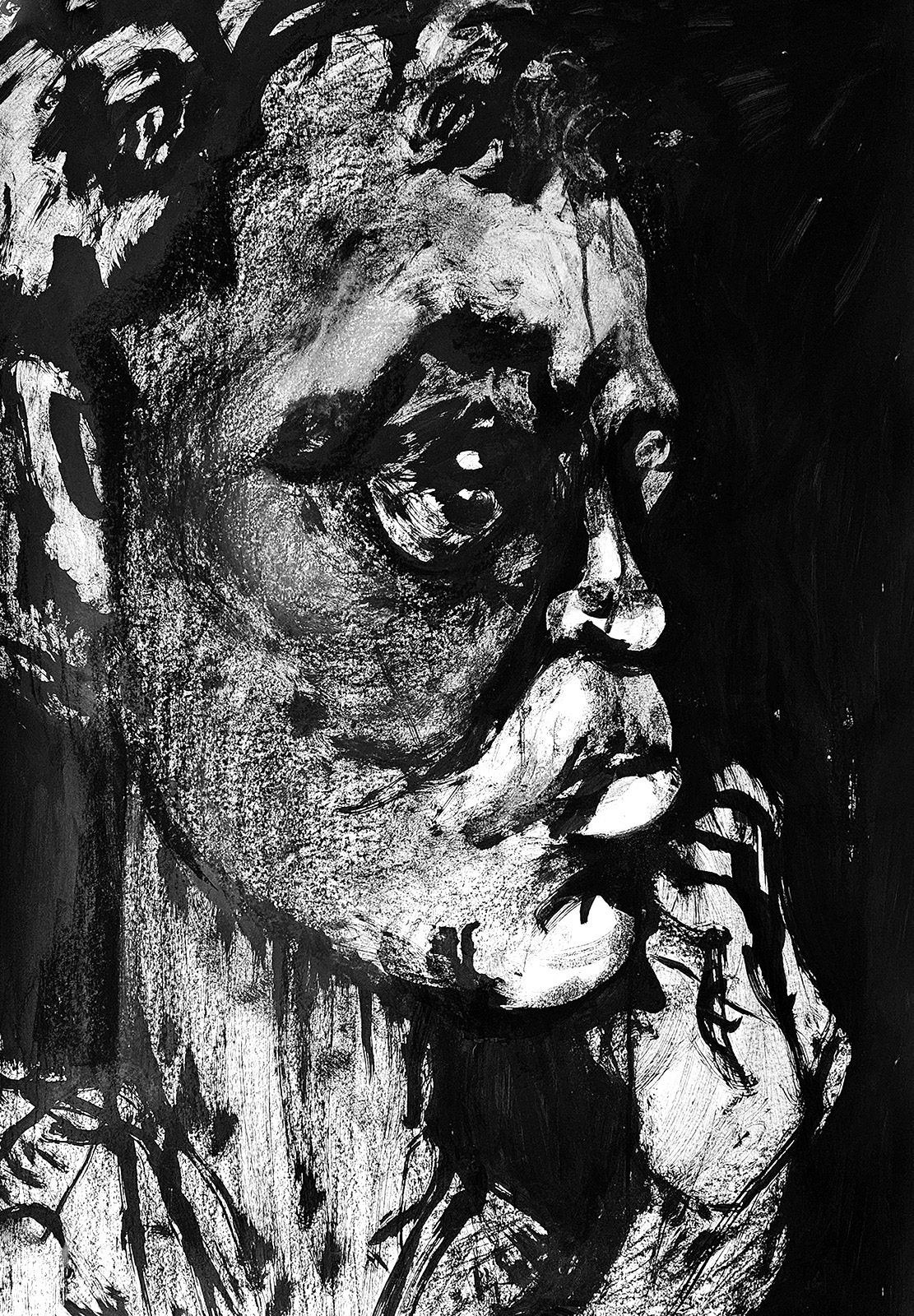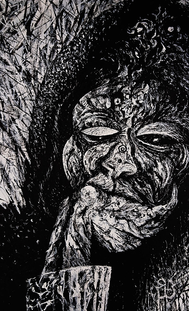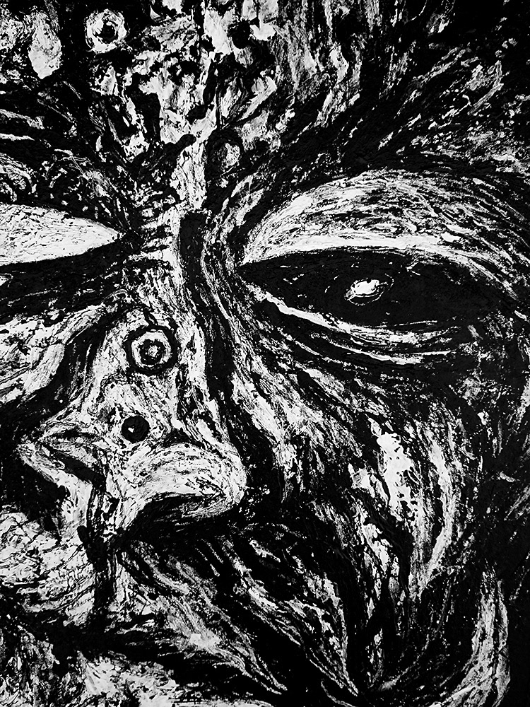 The multiple self-portrait, ink and acrylic paints on cardboard, dimensions 100 cm x 70 cm, 2024