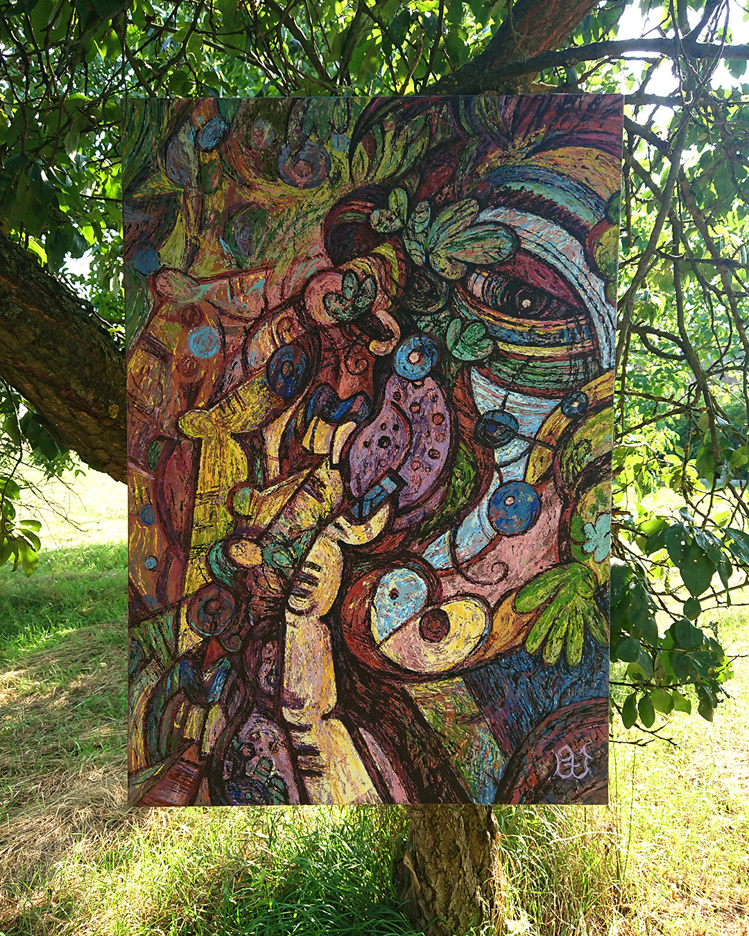 In raspberry bushes, acrylic paints on cardboard, dimensions 100 cm x 70 cm, 2023