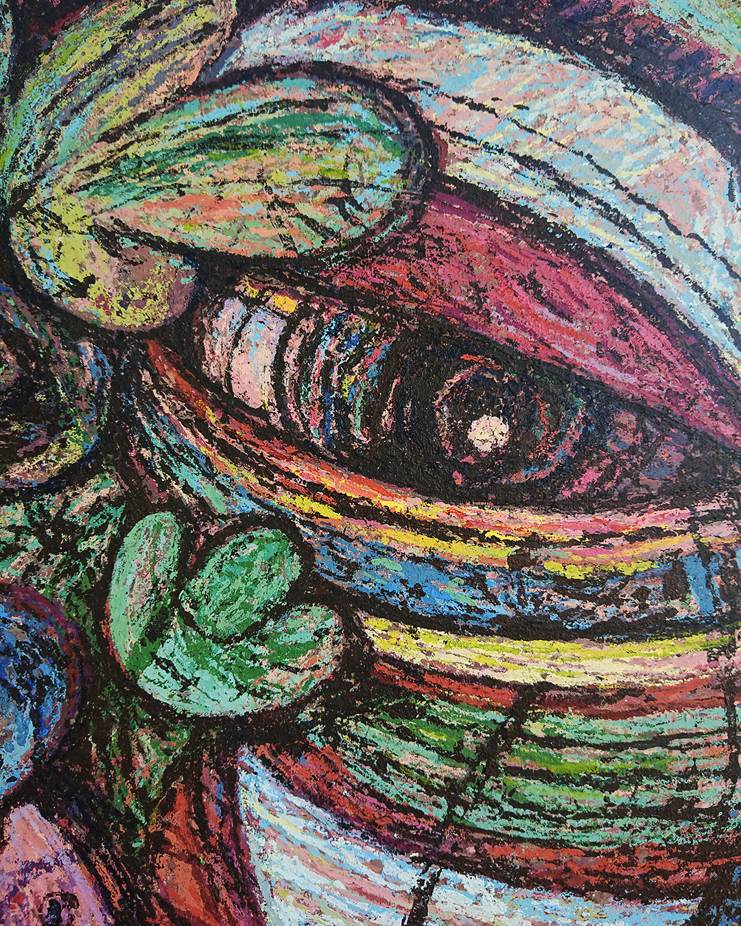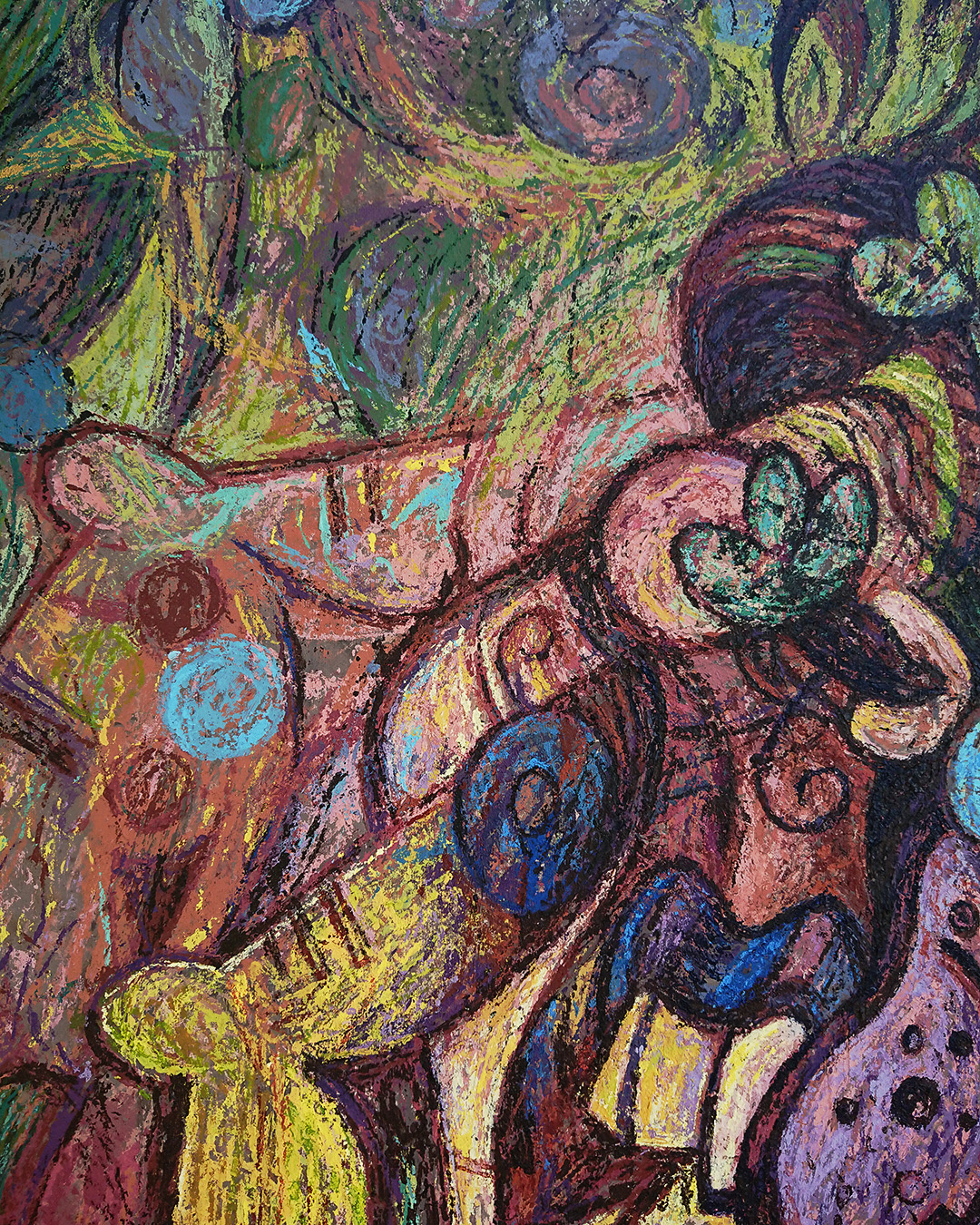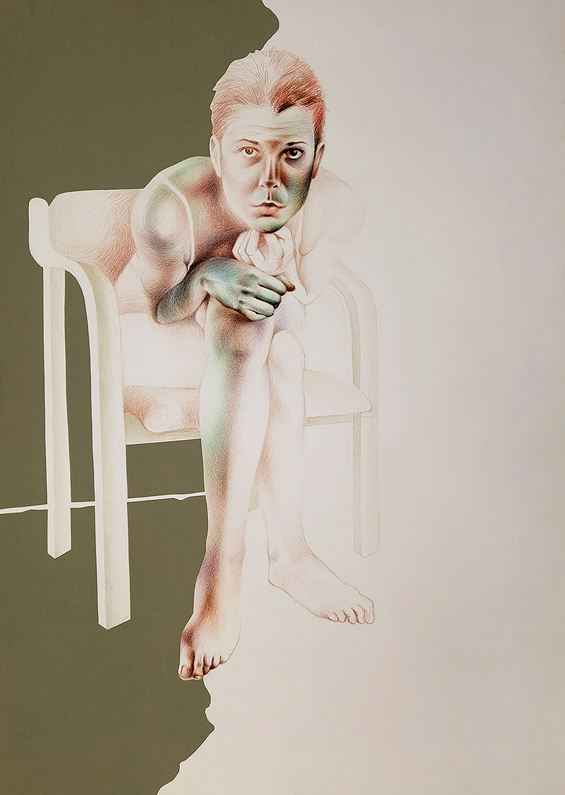 Look at me, crayons and collage on paper, dimensions 100 cm x 70 cm, 2023